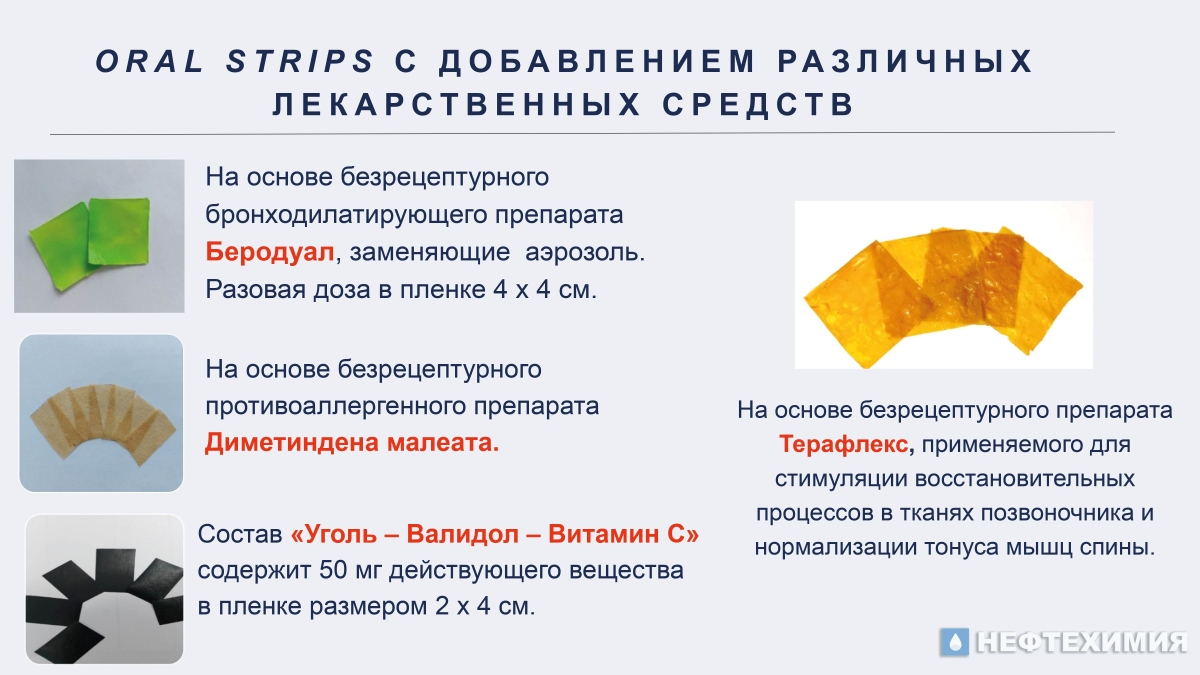 На данный момент мы изучили физико-механические свойства этих инновационных материалов и определили потенциальные области их применения, а также изготовили прототипы известных терапевтических препаратов и БАДов в виде новой лекарственной формы — oral strips, то есть ородиспергируемых пленок-полосок.