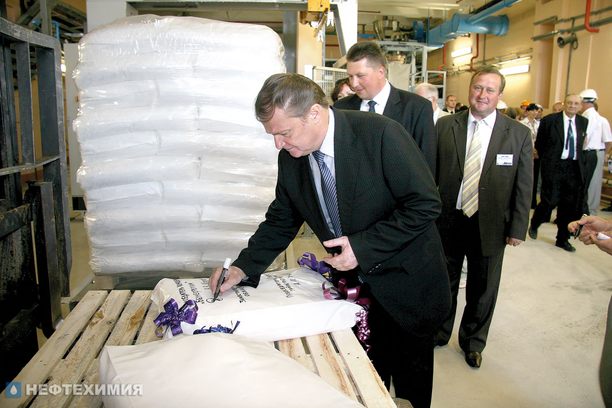 Начало выпуска фталевого ангидрида в полиэтиленовых мешках и биг-бегах. Автограф на новой упаковке ставит председатель концерна «Белнефтехим» Валерий Казакевич. Июль 2009 года