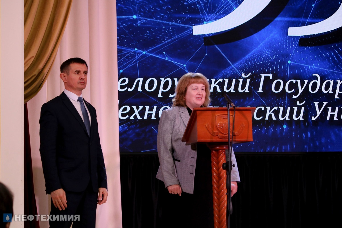 По поручению председателя концерна поздравление руководителю БГТУ передала Светлана Гурина. Кроме того, за вклад в подготовку высококвалифицированных научных и инженерных кадров для организаций нефтехимического комплекса, за результаты научных исследований в его интересах она наградила знаком «Ганаровы хiмiк» профессора кафедры полимерных композиционных материалов Жанну Шашок, Почетной грамотой концерна «Белнефтехим» — проректора по учебной работе Андрея Гаврилюка, профессора кафедры технологии неорганических веществ и общей химической технологии Людмилу Ещенко, доцента кафедры технологии стекла, керамики и вяжущих материалов Александра Кравчука.
