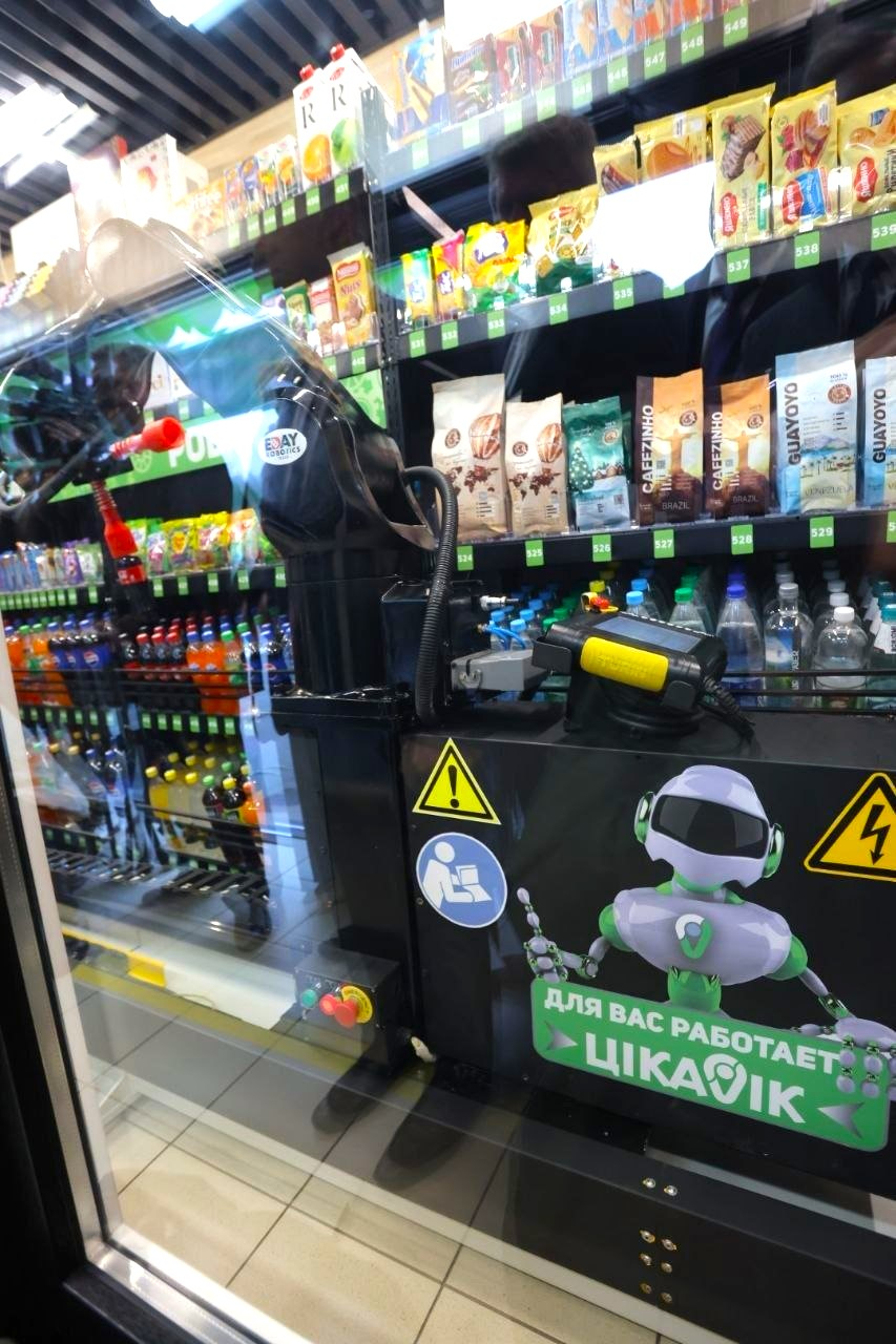 Цифровой торговый модуль полностью автоматизирует процесс покупки: принимает заказ, выбирает товар и выдает его клиенту. В ассортименте — сотни позиций, от жевательной резинки до пятилитровых канистр омывающей жидкости. Проект реализован РУП «Белоруснефть‑Гомельоблнефтепродукт» совместно с компанией «ИдэйРоботиксТрейд» при участии Управления цифровизации «Белоруснефти».